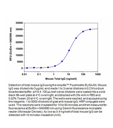 Our Amplite. Fluorimetric ELISA Assay Kit contains all the essential components including our fluorogenic Amplite. Red HRP substrate for ELISA detection. The kit provides an optimized assay protocol. It can detect as little as 0.4 ng/well of a monoclonal antibody. Its signal can be easily read by either a fluorescence microplate reader at Ex/Em = ~540/590 nm or an absorbance microplate reader at ~576 nm. It has been used for the assays in which goat anti-mouse IgG is served as a secondary detection agent.