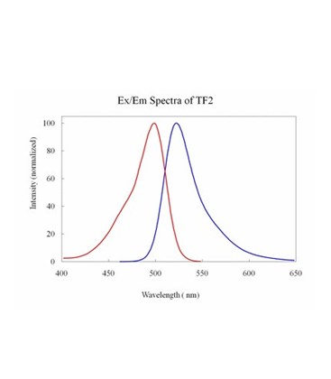 Tide Fluor™ 2 (TF2) family has the spectral properties similar to those of fluoresceins and Alexa Fluor® 488 (Alexa Fluor® is the trademark of Invitrogen). TF2 phosphoramidite enables the oligo labeling with the similar spectral properties and photostability of Alexa Fluor® 488 using the well established phosphoramidite chemistry. Compared to fluoresceins TF2 family has much stronger fluorescence and higher photostability. Additionally their fluorescence is pH-independent from pH 3 to 11. These characteristics make this new dye family a superior alternative to fluoresceins. TF2-labeled peptides and nucleotides exhibit much stronger fluorescence and higher photostability than the ones labeled with FITC or FAM. In addition, TF2 is an excellent replacement to the expensive Alexa Fluor® 488 due to their similar spectral properties, pH dependence and photostability. In pairing with our Tide Quencher™ 2 (TQ2), a variety of FRET peptides and nucleotides can be developed for detecting proteases and molecular beacons with enhanced sensitivity and stability.