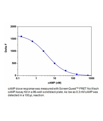 Screen Quest检测试剂盒是一类用于检测各种细胞离子通道以及电位等系列工具,包括膜电位、钙离子流、多药物抗性、氯离子以及氯离子通道等方面的指标。每种检测方案均能提供不同的检测方案。这些高效的检测方案为从多角度研究细胞功能活动提供了一种十分有效的方法。G蛋白偶联受体(GPCR)是药物发现过程最大的受体目标之一。钙通量(偶联于Gq信号通路)实验是药物筛选GPCR标的过程中优先使用方法。然而,超过60%已知GPCRs信号是通过偶联cAMP腺苷酸环化酶活性,而cAMP是胞内信号传导是一种重要第二信使。因此检测cAMP水平是筛选GPCRs激动剂和拮抗剂的最通用方法。Screen Quest No Wash FRET cAMP检测试剂盒提供另一种方便方法,来检测G蛋白偶联受体中腺苷酸环化酶的活性。与其他商业化cAMP ELISA检测试剂盒相比,该检测试剂盒不需要清洗和乙酰化步骤。本实验是基于cAMP荧光示踪物与无标记游离cAMP竞争性结合到有线的anti-cAMP抗体上的原理,即无标记的游离cAMP将HRP-cAMP/anti-cAMP抗体复合物中的cAMP荧光示踪物替换。其中anti-cAMP抗体上标记了独有的TR Fluor Tb,而cAMP荧光示踪物上则标记了bFluor 650。在缺少cAMP时,bFluor 650-cAMP荧光示踪物特异性的结合到TR Fluor Tb标记的anti-cAMP抗体上,产生强烈的荧光共振能量转移(FRET)。然而,当加入未标记的游离cAMP时,与bFluor 650-cAMP荧光示踪物竞争性的结合TR Fluor Tb标记anti-cAMP抗体复合物。由于bFluor 650标记的cAMP示踪物荧光寿命仅仅几纳秒,而结合到TR Fluor Tb标记的anti-cAMP抗体后,则由于FRET具有长得多的荧光寿命。这样,荧光共振能量转移(FRET)大小与样本中cAMP成比例,从而实现cAMP的定量。本实验可以方便的用于96和384微孔板。