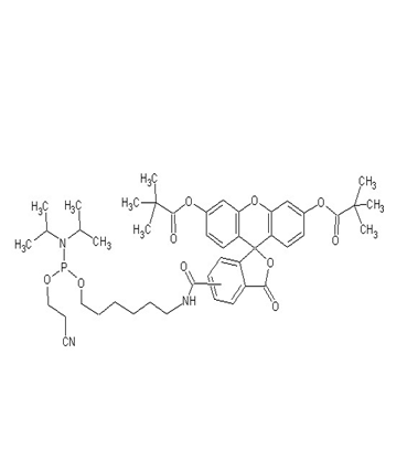有许多方法标记寡聚核苷酸,使其带有荧光。依据其光谱需求,标记的选择多元化。5’荧光-CE-亚磷酰胺,来源于6-羧基荧光素单一异构体。5’-六氯荧光素氨基磷酸酯(HEX)和5‘-四氯荧光素氨基磷酸酯。5(6)-FAM氨基磷酸酯产品的光谱学相关参数为Ex=494nm / Em=522nm;其对应分子量大小为843.94MW。