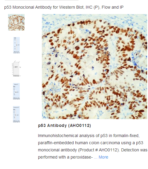 This antibody reacts with only mutant p53 protein under non-denaturing conditions (Immunoprecipitation) but reacts with both mutant and wild p53 under denaturing conditions (Western blot). It reacts with an epitope at aa 212-217.