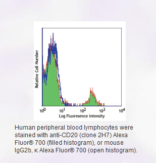 * Alexa Fluor® 700 has a maximum emission of 719 nm when it is excited at 633 nm / 635 nm. Prior to using Alexa Fluor® 700 conjugate for flow cytometric analysis, please verify your flow cytometer's capability of exciting and detecting the fluorochrome.