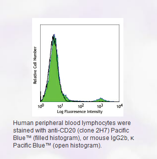 * Pacific Blue™ has a maximum emission of 455 nm when it is excited at 405 nm. Prior to using Pacific Blue™ conjugate for flow cytometric analysis, please verify your flow cytometer's capability of exciting and detecting the fluorochrome.