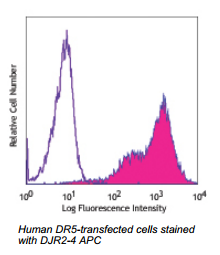 DR5 is 55 kD member 10B of the TNF receptor superfamily (TNFRSF10B), also known as TRAIL-R2, TRICK2, KILLER, and CD262. It binds the cytotoxic ligand TRAIL and induces apoptosis. The DR5 receptor is broadly expressed on a variety of normal tissues and many tumors. DR5 expression has been reported to be upregulated in human cells by interferon-α, 2-methoxyestradiol, and paclitaxel, and downregulated by adenoviral E3 proteins.