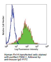 TWEAK receptor is also known as fibroblast growth factor inducible 14 kD protein (Fn14) or CD266. It is a 14 kD transmembrane protein that is expressed on a variety of tissue types. This receptor binds TWEAK and interacts with the cytoplasmic proteins TRAF1, 2, and 3. The TWEAK receptor is rapidly induced during liver regeneration and m play a role in hepatocyte growth. TWEAK receptor engagement can induce cell death and may play a role in inflammation. The ITEM-1 antibody is useful for flow cytometric analysis, induction of tumor cells apoptosis or necrotic cell death, enhancing endothelial cell proliferation, and immunohistochemistry on frozen tissues.
