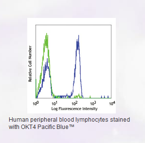 * Pacific Blue™ has a maximum emission of 455 nm when it is excited at 405 nm. Prior to using Pacific Blue™ conjugate for flow cytometric analysis, please verify your flow cytometer's capability of exciting and detecting the fluorochrome.