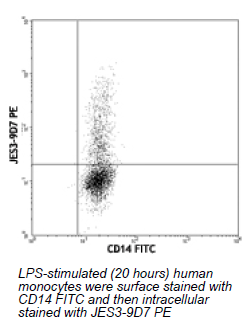 Each lot of this antibody is quality control tested by intracellular immunofluorescent staining with flow cytometric analysis. Test size products are transitioning from 20 μl to 5 μl per test. Please check your vial or your CoA to find the suggested use of this reagent per million cells in 100 μl staining volume or per 100 μl of whole blood. It is recommended that the reagent be titrated for optimal performance for each application.