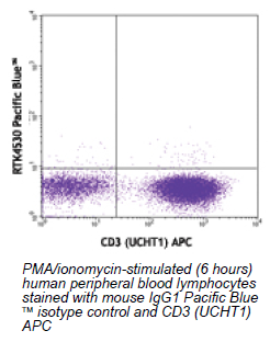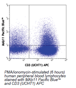 Each lot of this antibody is quality control tested by intracellular immunofluorescent staining with flow cytometric analysis. For immunofluorescent staining, the suggested use of this reagent is 0.5 μg per 106 cells in 100 μl volume. It is recommended that the reagent be titrated for optimal performance for each application.