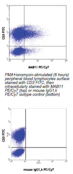 Each lot of this antibody is quality control tested by intracellular immunofluorescent staining with flow cytometric analysis. Test size products are transitioning from 20 μl to 5 μl per test. Please check your vial or your CoA to find the suggested use of this reagent per million cells in 100 μl staining volume or per 100 μl of whole blood. It is recommended that the reagent be titrated for optimal performance for each application.
