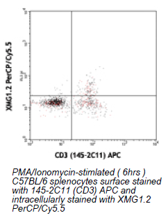 Each lot of this antibody is quality control tested by intracellular immunofluorescent staining with flow cytometric analysis. For immunofluorescent staining, the suggested use of this reagent is 5 μl per million cells or 5 μl per 100 μl of whole blood. It is recommended that the reagent be titrated for optimal performance for each application.
