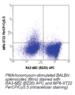 Each lot of this antibody is quality control tested by intracellular immunofluorescent staining with flow cytometric analysis. For immunofluorescent staining, the suggested use of this reagent is 5 μl per million cells or 5 μl per 100 μl of whole blood. It is recommended that the reagent be titrated for optimal performance for each application.