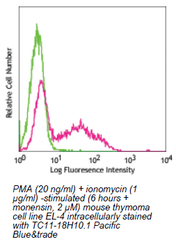 Each lot of this antibody is quality control tested by intracellular immunofluorescent staining with flow cytometric analysis. For immunofluorescent staining, the suggested use of this reagent is ≤0.25 μg per million cells in 100 μl volume or 100 μl of whole blood. It is recommended that the reagent be titrated for optimal performance for each application.