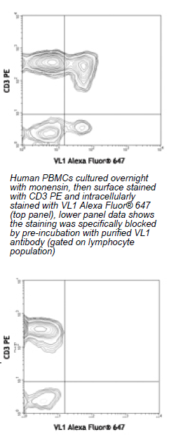 Each lot of this antibody is quality control tested by intracellular immunofluorescent staining with flow cytometric analysis. For immunofluorescent staining, the suggested use of this reagent is 5 μl per million cells or 5 μl per 100 μl of whole blood. It is recommended that the reagent be titrated for optimal performance for each application.