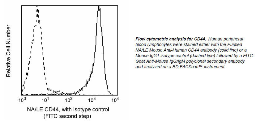 Reacts with CD44, and 85 kDa glycoprotein that is expressed on leukocytes, erythrocytes, epithelial cells and weakly on platelets. CD44 is a