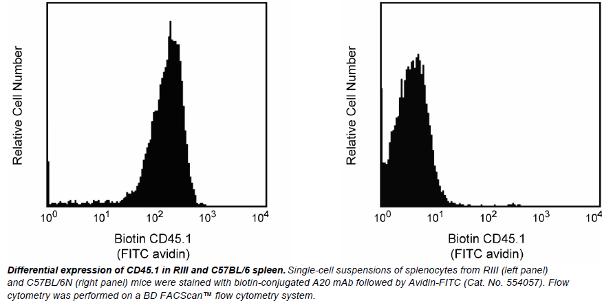 The A20 antibody reacts with CD45 (Leukocyte Common Antigen) on all leukocytes of mouse strains expressing the CD45.1 alloantigen (eg, RIII, SJL/J, STS/A, DA). This alloantigen was originally named Ly-5.2, and this was the designation at the time that the antibody was characterized. The designation was later changed from Ly-5.2 to Ly-5.1 to conform with the convention that the .2 alloantigen designations be assigned to the C57BL/6 strain. mAb A20 has been reported not to react with leukocytes of most other mouse strains, which express the CD45.2 alloantigen. CD45 is a member of the Protein Tyrosine Phosphatase (PTP) family: Its intracellular (COOH-terminal) region contains two PTP catalytic domains, and the extracellular region is highly variable due to alternative splicing of exons 4, 5, and 6 (designated A, B, and C, respectively), plus differing levels of glycosylation. The CD45 isoforms detected in the mouse are cell type-, maturation-, and activation state-specific. The CD45 isoforms play complex roles in T-cell and B-cell antigen receptor signal transduction. The A20 antibody has been reported to inhibit some responses of B cells, from mice expressing the CD45.1 alloantigen, to antigens and LPS.
