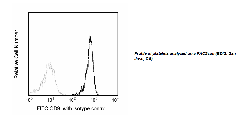 Reacts with a 24 kDa type III transmembrane protein which is expressed on platelets, pre-B cells, monocytes, endothelia, and epithelia. CD9