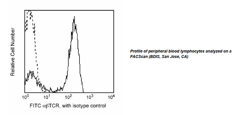 This antibody reacts with a monomorphic determinant of αβ T-cell receptor expressed on greater than 95% of normal peripheral blood CD3+