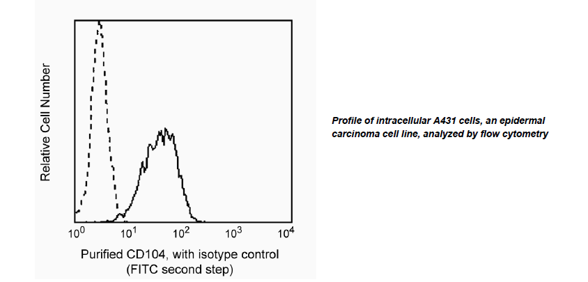 Reacts with CD104, integrin β4 chain, a 205 kDa transmembrane glycoprotein, associated with CD49f (integrin α6 chain) to form the α6/β4