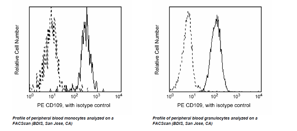 The TEA 2/16 monoclonal antibody specifically recognizes CD109 which is also known as C3 and PZP-like alpha-2-macroglobulin domain-containing protein 7 (CPAMD7), Gov platelet alloantigens, or 150 kDa TGF-beta-1-binding protein. CD109 is a 150-170 kDa glycosylphosphatidylinositol (GPI)-linked glycoprotein expressed on activated T cells, myeloid progenitor (CD34+) and mature myeloid lineage cells (monocytes, granulocytes, platelets), but not on CD34+ lymphoid progenitor cells. CD109 is also expressed on vein and artery endothelial cells. The expression of CD109 is upregulated on PHA-stimulated T cells. CD109 is reportedly expressed on long-term adult bone marrow cultured cells, where it is co-expressed with CD34 and CD90. Its biological role in hematopoiesis has not been fully elucidated. It may play a role in the negative regulation of transforming growth factor beta receptor signaling.
