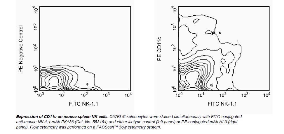 found on human NK cells. Although its expression on mouse NK cells is not published, we have detected CD11c on mouse splenic NK cells.