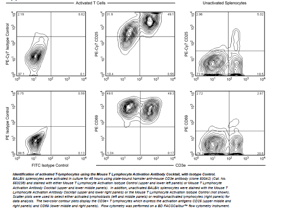 The Mouse T Lymphocyte Activation Antibody Cocktail is a three-color reagent designed to identify major subsets of T lymphocytes by direct