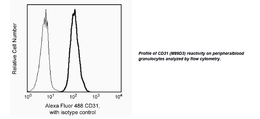 Reacts with CD31, also known as platelet endothelial cell adhesion molecule - 1 (PECAM-1), a sigle chain, type I transmembrane protein of