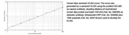 Antibody H32-406 reacts with B-lymphocyte stimulator protein (Blys), also known as BAFF (B cell activating factor) and is a member of the TNF ligand superfamily. Members of the TNF receptor and ligand superfamily play a critical role in regulating immune responses. Blys is a type II membrane protein expressed on cells of myeloid lineage including monocytes, dendritic cells, and activated T cells. Blys exists in both a membrane-bound and soluble form. In its soluble form, Blys is a potent B cell growth factor in costimulation assays, suggesting its biological role in monocyte-driven B cell activation. Blys has also been linked to B cell hyperplasia and autoimmunity.