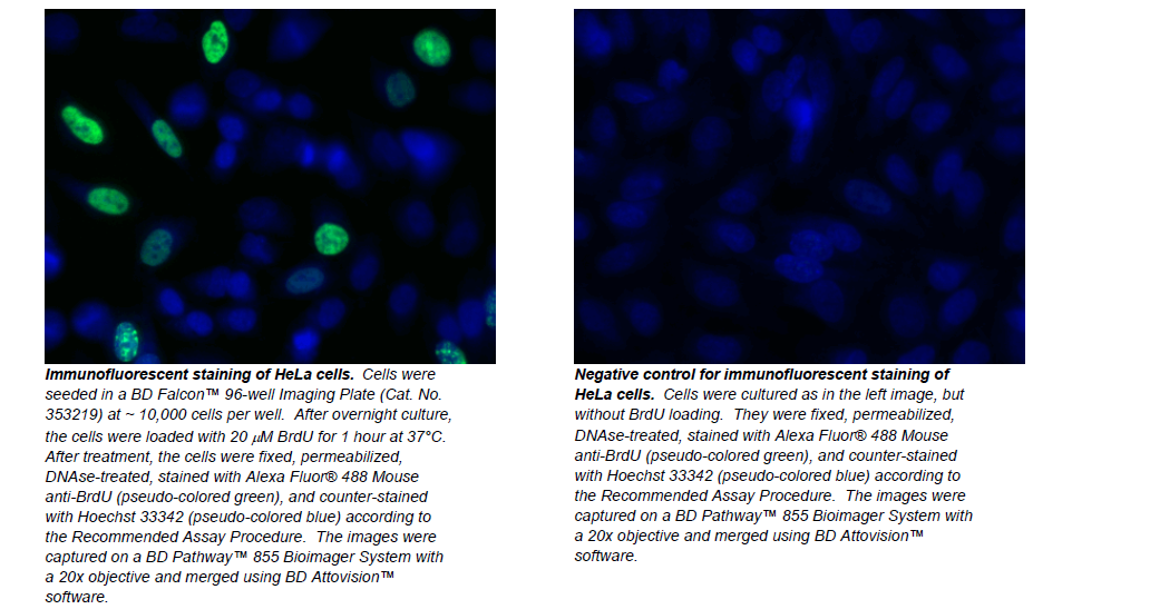 Bromodeoxyuridine (BrdU) is an analog of thymidine that can be incorporated into newly synthesized DNA by cells entering and progressing thru the DNA synthesis (S) phase of the cell cycle. The amount of BrdU that gets incorporated is dependent upon the amount of time that the vells are exposed to BrdU (pulse time), the rate of cell division, and whether the cells are in early, mid, or late S phase. Detection of incorporated BrdU allows the investigator to identify cycling cells in an asynchronous cell population and to determine cell cycle kinetics.