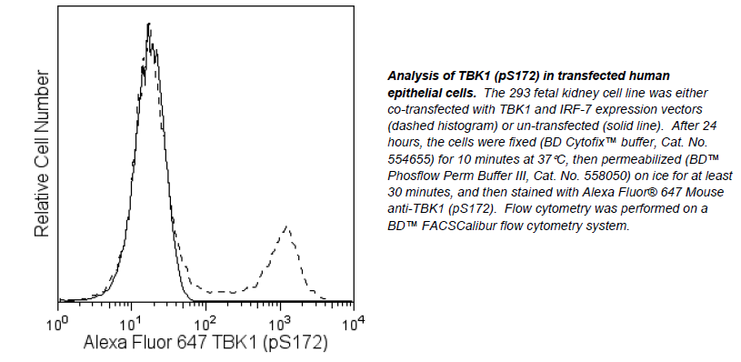 NF-kB is a ubiquitously expressed transcription factor that regulates many cytokine and Ig genes. It is involved in immune, inflammatory, viral, and acute phase responses. In most cells, NF-kB is sequestered in an inactive cytoplasmic form via interactions with the inhibitory proteins IkBα, IkBβ, and IkBε. Stimulation induces the release, activation, and nuclear translocation of NF-kB. Release of NF-kB results from the phosphorylation and proteolytic degradation of the IkB proteins. Two cytokine-inducible IκB kinases (IKKa and IKKb) phosphorylate and target the IkB proteins for degradation via the ubiquitin pathway. IKKg/NEMO, a third member of the IKK complex, functions as a regulatory subunit and interacts directly with IKKb. TBK1 (TANK-binding kinase 1, also known as T2K or NAK), a protein of 729 amino acids, is another member of the IKK family of kinases regulating NF-kB downstream of the tumor necrosis factor and Toll-like receptor pathways. TBK1 forms a complex with the adaptor proteins TANK (TRAF-associated NF-kB activator) and TRAF2 (TNF-receptor-associated factor 2), and this oligomer is required for activation and phosphorylation of TBK1 at serine 172 (S172). The J133-587 monoclonal antibody recognizes the phosphorylated S172 of human TBK1. Our in-house testing is performed on a cell line that has been co-transfected with TBK1 and IRF-7 because we have been unable to detect endogenous TBK1 (pS172) by western blotting of lysates from activated cell lines (HeLa activated with PMA and A431 activated with PDGF). In the transfectants, the over-expression of TBK1 is necessary for phosphorylation of IRF-7, but the presence of IRF-7 does not affect TBK1 expression or phosphorylation. We confirmed that mAb J133-587 does not cross-react with IRF-7 by ELISA.