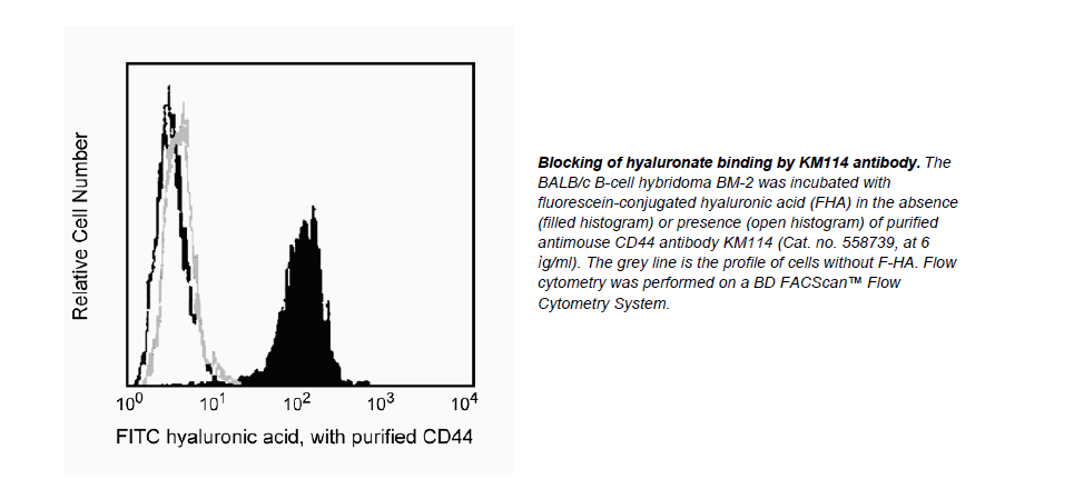 The KM114 antibody reacts with an epitope on both alloantigens and all isoforms of the CD44 glycoprotein (Pgp-1, Ly-24). The KM114 hybridoma was produced at the same time as the published clone KM201, and the mAb recognizes a different epitope from that recognized by mAb IM7. The standard form of CD44, lacking variable exons and referred to as CD44H or CD44S, is widely expressed on hematopoietic and non-hematopoietic cells. CD44 isoforms encoded by variable exons are expressed on epithelial cells, but only at low levels on most leukocytes. Mice with the Ly-24.1 alloantigen (e.g., BALB/c, CBA/J, DBA/1, DBA/2) have relatively large subsets of CD44H+ T lymphocytes, while Ly-24.2 strains (e.g., A, AKR, CBA/N, C3H/He, C57BL, C57BR, C57L, C58, NZB, SJL, SWR, 129) have lower expression of CD44H on T cells. CD44 is a cell adhesion receptor, and its ligand, hyaluronate, is a common component of extracellular matrices. Differential glycosylation of CD44 influences its binding to hyaluronate. Additional ligands include the cell-surface form of CD74 and the cytokine osteopontin (Eta-1).10 Bone marrow- and thymus-derived progenitor cells capable of repopulating the thymus express CD44. In the periphery, the level of CD44 expression increases upon activation of B lymphocytes, CD4+ T cells, and CD8+ T cells; and memory cells can be recognized by their CD44[hi] phenotype. KM114 antibody can be used in ELISA to detect soluble CD44, and it is effective for in vitro blocking of hyaluronate recognition by CD44. It has been reported that KM114 mAb cross-reacts with CD44 of the Chinese hamster, Cricetulus griseus, but not human CD44.