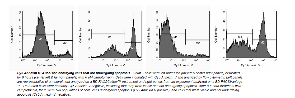 apoptosis. Since externalization of PS occurs in the earlier stages of apoptosis, Cy5 Annexin V staining can identify apoptosis at an earlier