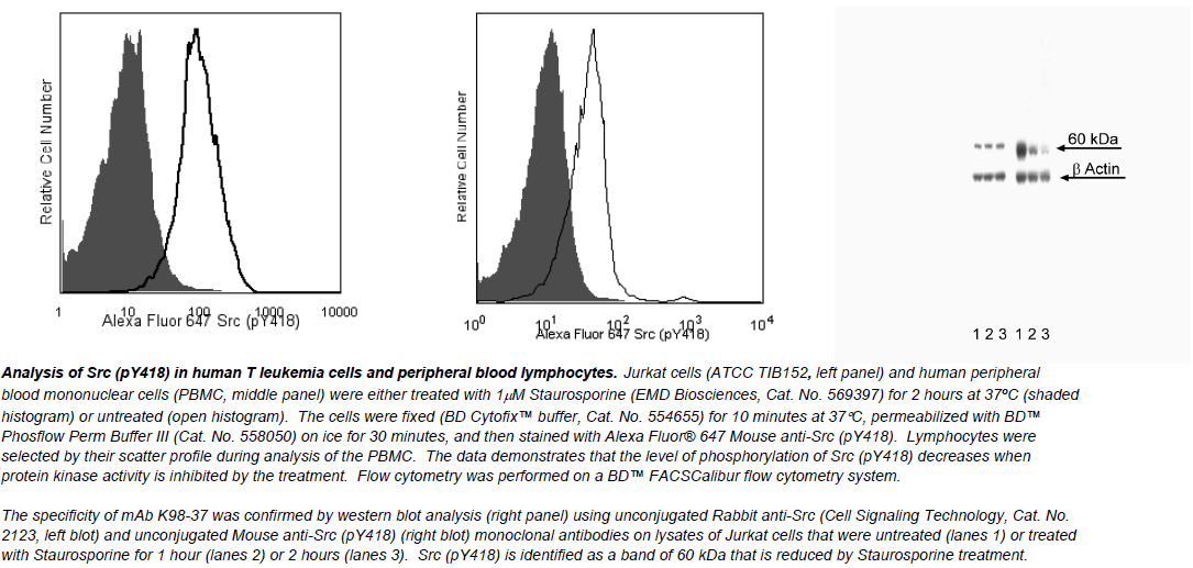 The K98-37 monoclonal antibody recognizes the phosphorylated Y418 in the protein kinase domain of activated Src. The orthologous