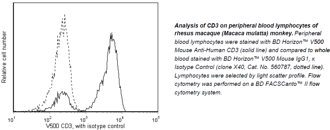 The antibody is conjugated to BD Horizon™ V500, which has been developed for use in multicolor flow cytometry experiments and is available exclusively from BD Biosciences. It is excited by the Violet laser with an Ex max of 415 nm and Em Max at 500 nm. BD Horizon V500 conjugates emit at a similar wavelength to Amcyan yet exhibit reduced spillover into the FITC channel. For more information on BD Horizon V500, visit bdbiosciences.com/colors.