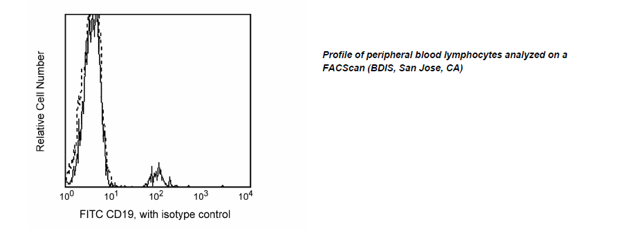 The HIB19 monoclonal antibody specificially binds to the 95 kDa type I transmembrane CD19 glycoprotein. CD19 is expressed during all