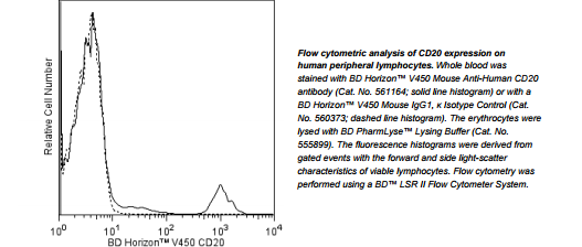 The L27 antibody specificially binds to CD20. CD20 is a 33-37-kDa four transmembrane phosphoprotein that is expressed by B lymphocytes from the pre-B stage and most malignant B cells and is lost during plasma cell differentiation. Low level CD20 expression is observed on a subset of normal circulating T lymphocytes, and CD20-positive T-cell lymphomas have been reported. The CD20 molecule is associated with membrane lipid raft domains, acts as a channel for calcium ions, and is involved in the regulation of B cell activation and survival. The cytoplasmic domain regions are serine and threonine rich and contain multiple phosphorylation consensus sequences. The antibody is conjugated to BD Horizon™ V450, which has been developed for use in multicolor flow cytometry experiments and is available exclusively from BD Biosciences. It is excited by the Violet laser Ex max of 406 nm and has an Em Max at 450 nm. Conjugates with BD Horizon™ V450 can be used in place of Pacific Blue™ conjugates.