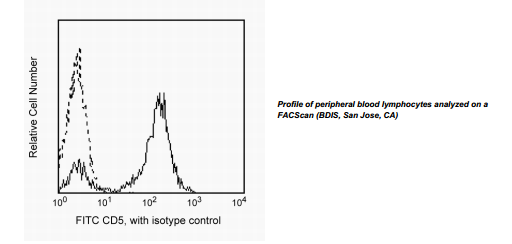 The UCHT2 monoclonal antibody specifically binds to CD5. CD5 is a 67 kDa single-chain, type 1 transmembrane glycoprotein expressed on