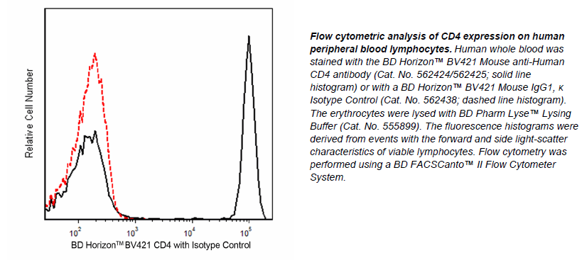The antibody was conjugated to BD Horizon™ BV421 which is part of the BD Horizon™ Brilliant Violet™ family of dyes. With an Ex Max