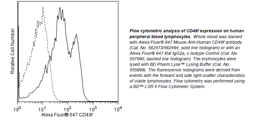 form the α6 β4 complex, also known as the laminin and kalinin receptor. CD49f is expressed mainly on T cells, monocytes, platelets, epithelial