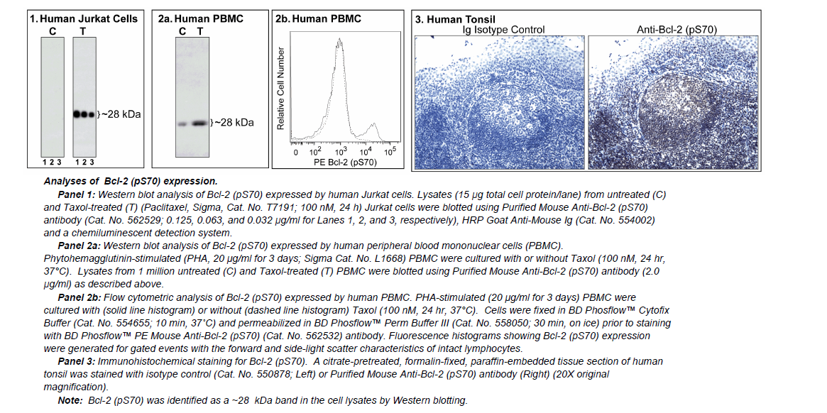 The clone N46-467 monoclonal antibody specifically binds to Bcl-2 (pS70), ie, the Bcl-2 protein phosphorylated at the Ser70 site. Bcl-2 is a ~