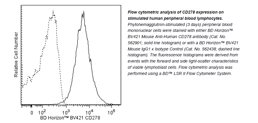 The antibody was conjugated to BD Horizon™ BV421 which is part of the BD Horizon™ Brilliant Violet™ family of dyes. With an Ex Max