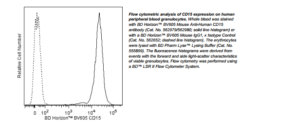 This antibody is conjugated to BD Horizon BV605 which is part of the BD Horizon Brilliant™ Violet family of dyes. With an Ex Max of