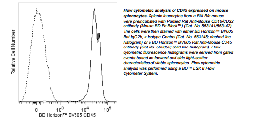 This antibody is conjugated to BD Horizon BV605 which is part of the BD Horizon Brilliant™ Violet family of dyes. With an Ex Max of