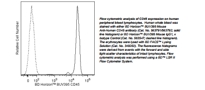The HI30 monoclonal antibody specifically binds to the 180, 190, 205, 220 kDa protein isoforms of CD45. CD45 is encoded by the PTPRC (Protein tyrosine phosphatase receptor type C) gene. CD45, also known as the leukocyte common antigen (LCA), is a member of the protein tyrosine phosphatase (PTP) family. It is present on all human leukocytes including lymphocytes, monocytes, granulocytes, eosinophils, and thymocytes. CD45 is absent from circulating erythrocytes, platelets, or mature erythroid cells of bone marrow and non-hemopoietic tissues. The antibody was conjugated to BD Horizon™ BUV395 which has been exclusively developed by BD Biosciences as an optimal dye for use on a 355 nm laser equipped instrument. With an Ex Max at 348 nm and an Em Max at 395 nm, this dye has virtually no spillover into any other detector. BD Horizon™ BUV395 can be excited with a 355 nm laser and detected with a 379/28 filter.