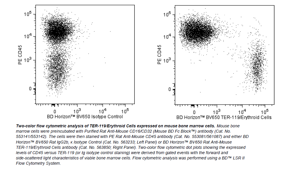 epitope is not detected on hematopoietic stem cells, lymphoid cells, myeloid cells, or erythroleukemia lines. The TER-119 mAb is a