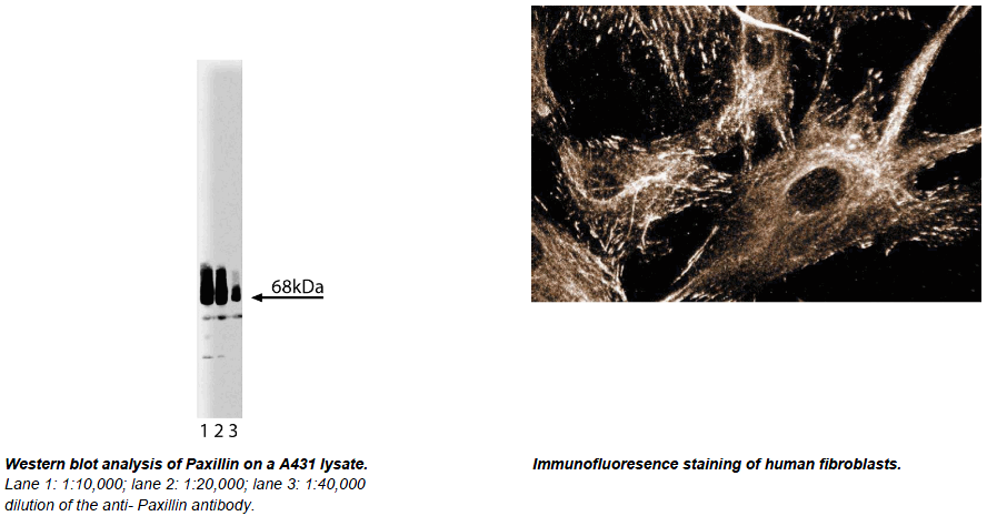the 68 kDa paxillin protein. Paxillin is a cytoskeletal component that localizes to the focal adhesions at the ends of actin stress fibers. It is also