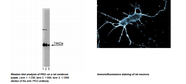 The Protein Kinase C (PKC) family of homologous serine/threonine protein kinases is involved in a number of processes such as growth, differentiation, and cytokine secretion. At least eleven isozymes have been described. These proteins are products of multiple genes and alternative splicing. PKC consists of a single polypeptide chain containing four conserved regions (C) and five variable regions(V). The N-terminal half containing C1, C2, V1, and V2 constitutes the regulatory domain and interacts with the PKC activators Ca 2+, phospholipid, diacylglycerol, or phorbol ester. However, the novel PKC (nPKC) subfamily members (δ, ε, η, and θ isoforms) and the atypical PKC (aPKC) subfamily members (ζ, ι, and λ isoforms) are Ca2+ independent and lack the C2 domain. The aPKC members are unique in that their activity is independent of diacylglycerols and phorbol esters. They also lack one repeat of the cysteine-rich sequences that are conserved in cPKC and nPKC. The C-terminal region of PKC contains the catalytic domain. The PKC pathway represents a major signal transduction system that is activated following ligand-stimulation of transmembrane receptors by hormones, neurotransmitters, and growth factors. PKCι was isolated from a human kidney cDNA library. It is highly expressed in brain and lung, but it is also seen in many other tissues at lower levels. PKCι shows the most similarity to PKCζ , 72% overall identity. These two enzymes share a highly conserved pseudosubstrate sequence, the absence of a Ca2+-binding region, and the presence of only one zinc finger-like domain. It is thought that PKCι has a role in the secretory response to nutrients.
