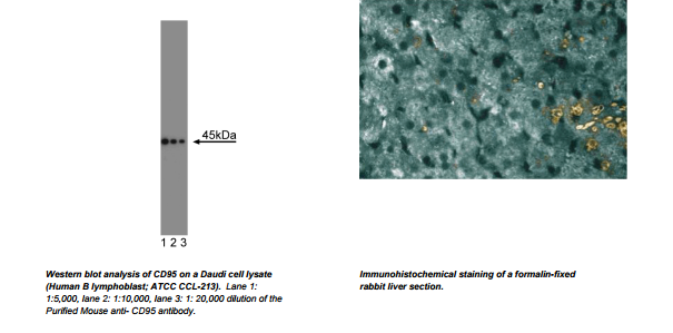 CD95 is a member of a family of cell surface receptors that includes tumor necrosis factor receptor (TNF-R), nerve growth factor receptor (NGF-R), CD40, CD27, CD30, and 4-1BB. Both murine and human Fas genes have been cloned and reportedly share 60% similarity in their amino acid sequences. CD95 (Fas) is a cell surface apoptosis-signaling molecule that is widely expressed in sites such as thymus, liver, heart, and ovary. Abnormalities in the Fas gene correlate with autoimmune features in mice and with unusually high levels of lymphocyte apoptosis in HIV-infected humans. Genetic studies have localized the Fas gene near the lpr (lymphoproliferation disease) locus on mouse chromosome 19 and further characterization reportedly has revealed that lpr is a mutation affecting the function of the Fas gene.