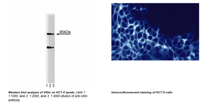 microvillar actin bundles of the intestinal brush border, villin is a 95 kDa protein composed of two very similar domains of approximately 44