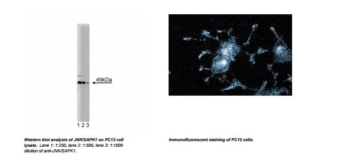 The Ras signaling pathway links the signals from growth factor receptors with the activation of the MAPK kinase cascade of phosphorylation leading to cell growth and differentiation. External stimuli, such as endotoxins, UV irradiation, heat, and hyperosmolarity, induce an array of cellular responses that culminate with gene expression, ultimately dictating an adaptation to the new environment. The ultimate cellular response to environmental stress is cell death or apoptosis. This pathway is regulated by Rac1 and Cdc42 which link Jun Kinases (JNKs), such as p38. JNK is a c-Jun kinase that was also identified as SAPK1 and MAPKp49. JNK contains homology with the MAP/ERK family of kinases, and contains an N-terminal ATP-binding site and two autophosphorylation "TXY" sites. JNKK1/MEKK4/SEK1 is a dual-specificity kinase activated by conditions of cellular stress, such as heat shock and hyperosmolarity. JNKK1 phosphorylates JNK and p38 but not the ERK MAP kinases. Active JNK and p38 phosphorylate multiple transcription factors that induce expression of genes, such as proinflammatory cytokines.