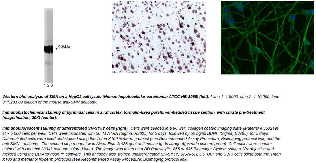 amino acids and migrates with apparent molecular weight of 40 kDa. In addition to the cytoplasm, other studies localized SMN in dots of